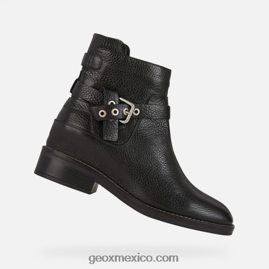 botín transpirable de tacón bajo para mujer con una actitud intrépida pero femenina. Larysse, confeccionado con cuero curtido negro, presenta detalles llamativos, en primer lugar, la correa con hebilla que abraza el tobillo. esta bota de estilo urbano moderno y de aspecto contemporáneo elevará incluso los atuendos más simples con un toque de estilo. presenta una cómoda cuña interna para alargar la figura.transpirabilidadcaracterísticas