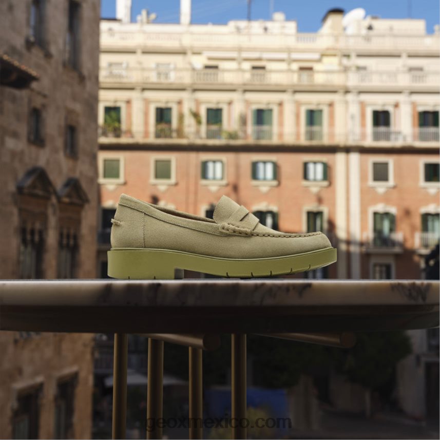mocasines innovadores ultraamortiguadores para mujer repletos de estilo contemporáneo. spherica ec1 a es una nueva versión contemporánea del clásico mocasín penny, mejorado con niveles incomparables de comodidad para una maravillosa sensación de bienestar durante todo el día. Confeccionado en ante en una paleta verde pistacho fácil de combinar, descansa sobre una suela con tacos en contraste.