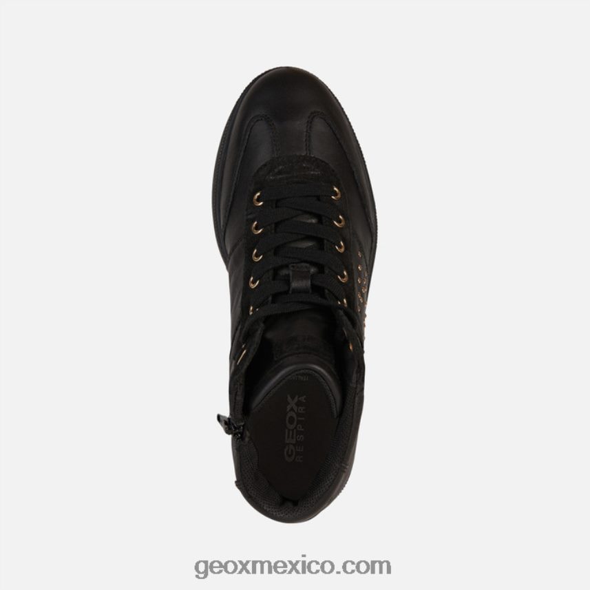 zapatilla de caña media para mujer con una estética casual contemporánea. Con una atractiva estética de baloncesto actual, la zapatilla meleda combina perfectamente con atuendos de tiempo libre y looks informales. la parte superior completamente negra y flexible se ha adornado con pequeñas tachuelas y detalles dorados brillantes.